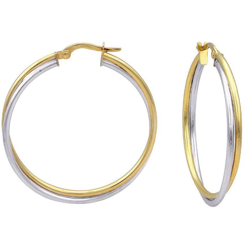 These two-tone hoops will match with all of your jewelry. 14K white and yellow gold intertwine to give a chic look.