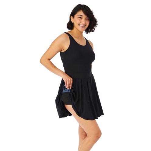 Crafted for effortless style and comfort, this dress offers just the right amount of stretch to create a flattering silhouette that moves with you. The design pairs bold wide front straps with practical thin straps and built-in shorts, giving you a secure, comfortable fit.