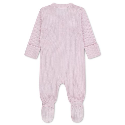Delicate pointelle fabric adds soft texture to this cozy coverall. The footed silhouette keeps the look sweet and comfortable. A charming one-piece with a gentle, classic feel.