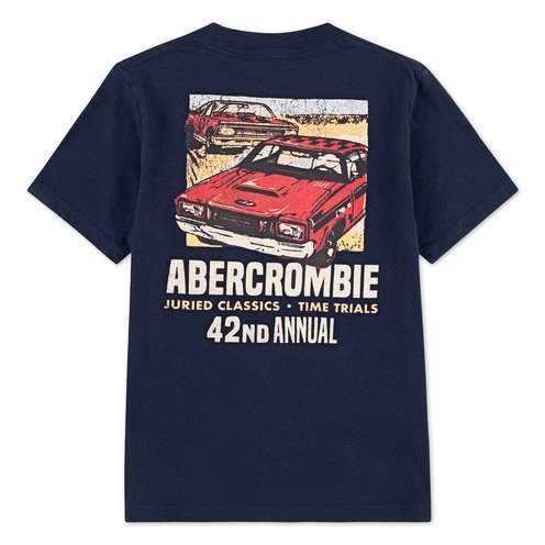 Gear up for style with this abercrombie kids tee! Soft jersey fabric and ribbed collar ensure comfort. Short sleeves keep you cool while admiring your favorite rides. Eye-catching Abercrombie graphics on front and back rev up the fun. Start your engines in fashion!