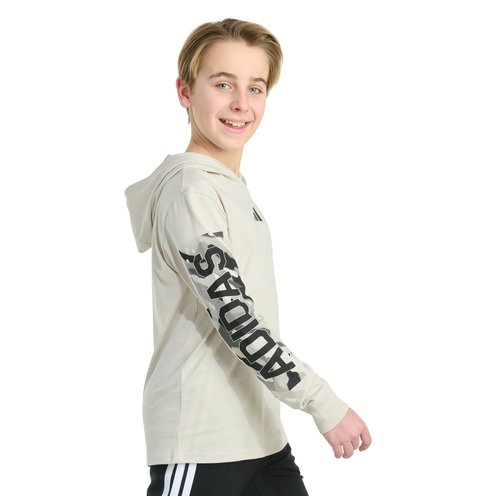 This boys' hooded tee gives him a light layer to slip on at school or post-practice. The all-cotton fabric feels soft and comfortable. Camo-detailed adidas logos add an athletic sign-off.