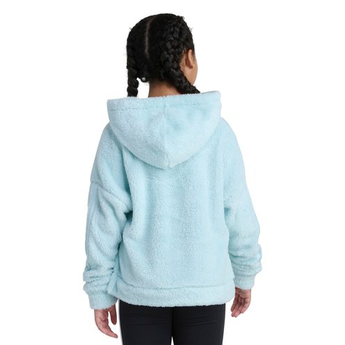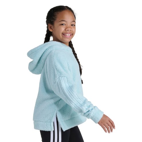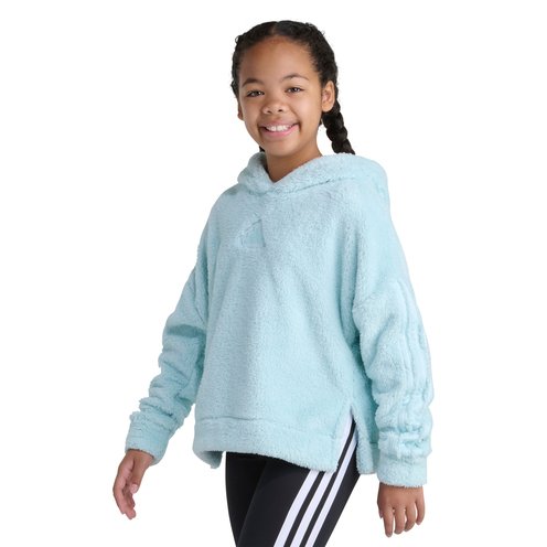 Cozy vibes only. Extra-soft and fuzzy, this girls' pullover hoodie is the perfect warm layer on cool days. Drop shoulders give it a laid-back feel, and 3-Stripes add a classic touch.