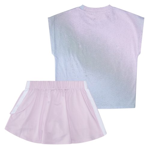 The box tee features an expressive spray gradient all-over print and the iconic 3 Bar Logo, adding a splash of color to the day. The faux wrap skort has a flouncy asymmetrical hem for a playful look, while its encased elastic waistband and internal bike shorts offer comfort and ease during active moments.