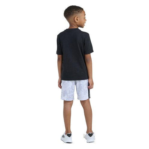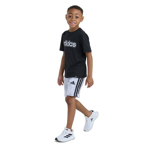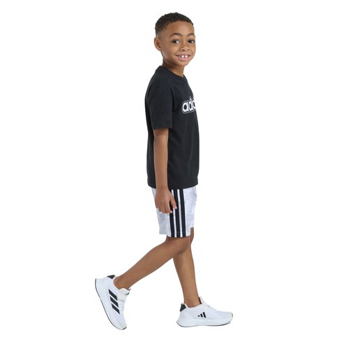 Combining style and practicality, this adidas two-piece set is designed to get your little one ready for playtime. The set includes a short sleeve tee with a bold adidas linear logo and a pair of camo print shorts. The tee features a rib-knit crewneck and regular fit for a comfortable feel, making it a great choice for days out playing with friends or relaxing at home. With an encased elastic waistband for easy wear, the shorts make a practical addition to your active kid's wardrobe. The adidas 3 Bar Logo loop tag and adidas Linear logo screen print on the tee brings as bold, sporty feel to the outfit, and the matching camo print on the shorts completes the look. Great for active days or staying in, this set combines style and practicality, making it a go-to choice for any little adventurer.