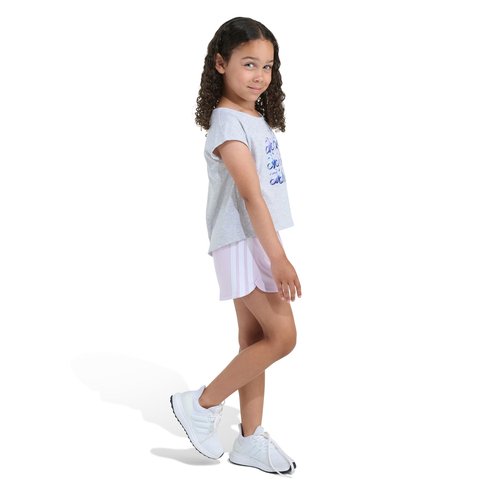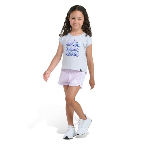 Get your little one ready for playtime with this adidas two-piece set. The tee features a liquid chrome triple stack puff-gel adidas logo on the front, adding a fun twist to their outfit. The tee also includes a self-fabric bound crew neck and a center back pleat, finishing it with stylish yet comfortable details. The shorts are made from closed hole mesh that offers breathability and comfort for active days, while an elastic waistband helps to make them easy to wear. Finished with adidas' bold 3-Stripes graphic down the side of the shorts, this is a set infused with a feeling of energy and playfulness. Pull it out for school activities or weekend adventures.