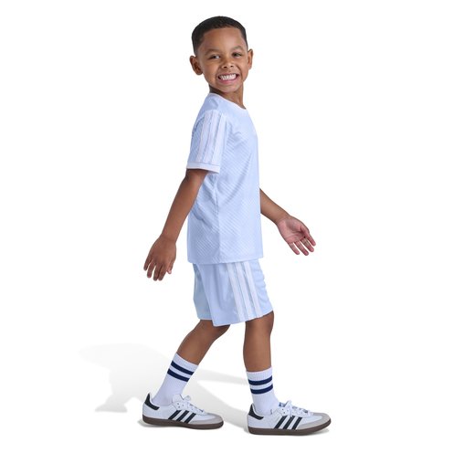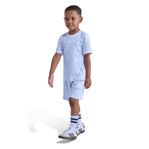 This vibrant two-piece set from adidas is built to get your little athletes moving in style. The short sleeve tee features a dynamic World Cup print and bold stripes down the sleeves, giving a classic sporty look. The shorts complement the tee with a matching 3-Stripes design down the legs. With an encased elastic waistband for easy wear, the shorts make a great addition to your active kid's wardrobe. The tee has a regular fit for a comfortable feel, making it a versatile option for active days. The 3 Bar Logo heat transfer adds the final sporty touch, making this set a great choice for kids who are on the move.