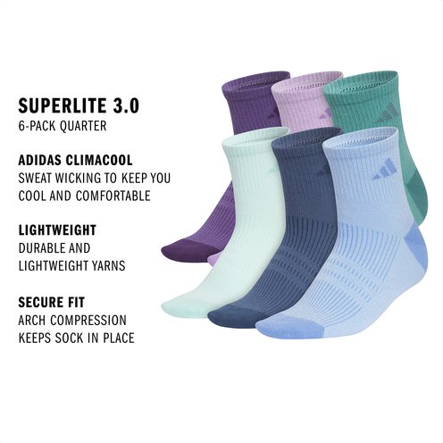 Your feet are your foundation. Treat them right with these super-light adidas socks. Lightweight and long-lasting, they hug your feet with a secure fit and supportive arch compression. Don't worry about breaking a sweat. Moisture-wicking yarn keeps feet fresh.