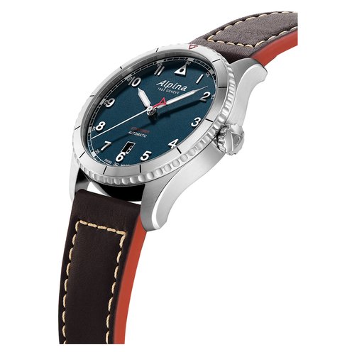 The Alpina Startimer Automatic, inspired by its heritage look and incomparable precision, features a 41mm brushed and polished 2-part stainless steel case and notched bezel, designed in the early days of aviation, making it easier to grip with gloves. WR to 100M, with a dial featuring a date window at 6 o'clock. Outer ring with seconds graduation. Set on a calfskin leather strap, adorned with top-stitching in a beige matching the index markers. Perfect for the aviator at heart.