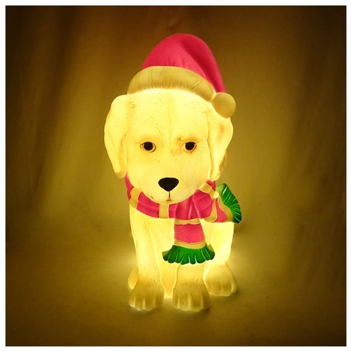 Add cheerful holiday spirit to your home with the Alpine Corporation Golden Retriever Dog with Santa Hat and LED Lights. This adorable golden retriever, complete with a red Santa hat, shines brightly with built-in LED lighting to create a warm and inviting glow.