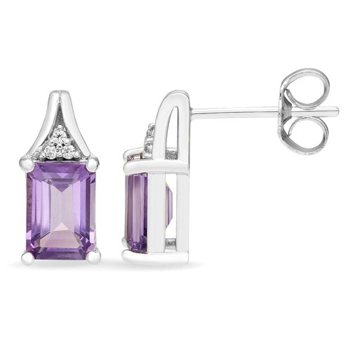 Set a sophisticated tone with these stunning gemstone stud earrings. Crafted in sterling silver, each luxe earring features a 7.0 x 5.0mm emerald-cut bright purple amethyst wrapped in an octagonal frame of shimmering white sapphire. Buffed to a brilliant luster, these earrings secure with friction backs.