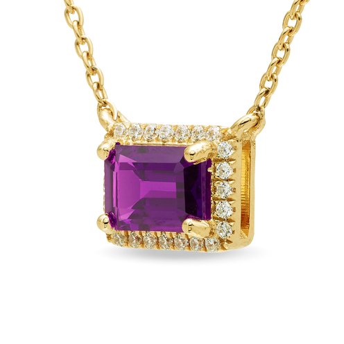 This gorgeous gemstone pendant is a brilliant gift-giving choice for February birthdays and anniversaries. Ornate emerald-cut amethysts deliver standout style when sweetly embraced with bright round-cut white lab-created sapphires. Fashioned in stylish sterling silver, yellow gold plated, this pendant suspends along an 18.0-inch diamond cut cable chain that secures with a lobster clasp.