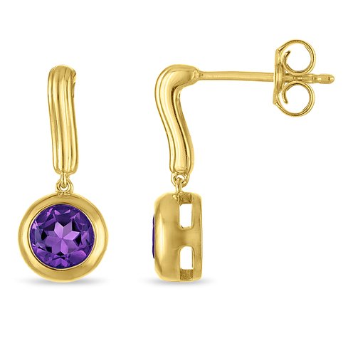 A charming choice, these petite Amethyst drop earrings simply go with everything. Crafted in sterling silver with yellow gold plating, each earring features a dainty pendulum with a 5.0mm round Amethyst in a bezel setting. These circle-post earrings secure comfortably with friction backs.