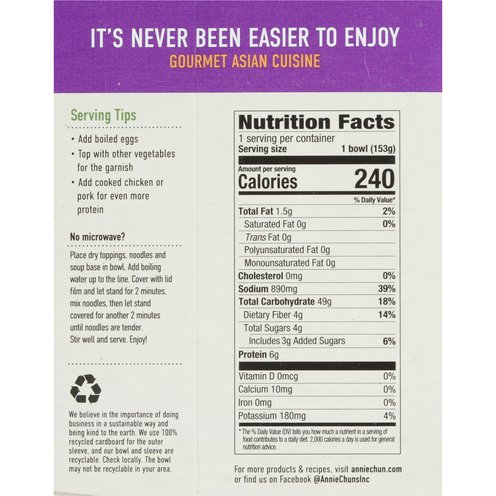 Japanese-style shoyu ramen soup bowl with cooked ramen noodles. Savory broth with corn, carrots and green onions. 0 mg cholesterol per serving. Vegan. Low fat. See nutrition information for sodium content. Non-GMO Project verified. Simple gourmet Asian cuisine. Ready in 2-1/2 minutes. Microwavable. It's never been easier to enjoy. Get ready to be instantly transported to an authentic ramen house. Our take on this popular soup blends savory vegetable broth with tender ramen noodles, green onions, carrots and corn. Delicious broth and perfectly cooked noodles, on your table in just 3 minutes. At Annie Chun's, we make delicious, easy-to-prepare, Asian-inspired dishes that you can feel good about. That's our promise, and we don't take it lightly. It's what drives us each day to make our foods easier to enjoy and better for you, without sacrificing the vibrant aromas, flavors and textures that we all love. We believe in the importance of doing business in a sustainable way and being kind to the Earth. We use 100% recycled cardboard for the outer sleeve, and our bowl and sleeve are recyclable. Check locally. The bowl may not be recyclable in your area.