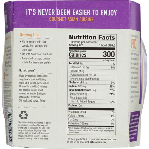 A rich vegetable broth with scallions & shiitake mushrooms. 0 g saturated fat per serving. 0 g cholesterol per serving. Vegan. Low fat food. See nutrition information for sodium content. Non-GMO Project verified. Simple gourmet Asian cuisine. Ready in 2-1/2 minutes. Microwaveable. It's never been easier to enjoy. You're about to enjoy some Vietnamese happiness. Our take on Vietnam's national soup blends rich vegetable broth with tender Hokkien noodles, scallions and bok choy. It's a delightful flavor extravaganza, with a long-simmered taste that's as good for you as the smile on your face. At Annie Chun's, we make delicious, easy-to-prepare, Asian-inspired dishes that you can feel good about. That's our promise, and we don't take it lightly. It's what drives us each day to make our foods easier to enjoy and better for you, without sacrificing the vibrant aromas, flavors and textures that we all love. Microwavable. We believe in the importance of doing business in a sustainable way and being kind to the earth. We use 100% recycled cardboard for the outer sleeve. and our bowl and sleeve are recyclable. Check locally. The bowl may not be recyclable in your area.