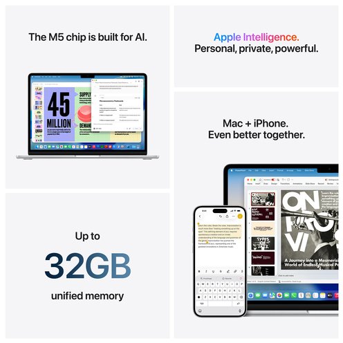 MacBook Air with the M5 chip brings blazing speed and powerful AI capabilities into an incredibly portable design. With Apple Intelligence, up to 18 hours of battery life, and fast SSD storage starting with 512GB, you can work, create, and play anywhere life takes you.