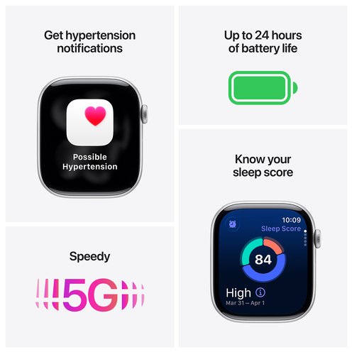 Apple Watch Series 11 brings you invaluable health insights including hypertension notifications and sleep score. Boost your fitness with advanced metrics and Workout Buddy powered by Apple Intelligence from your nearby iPhone. Get up to 24 hours of battery life.