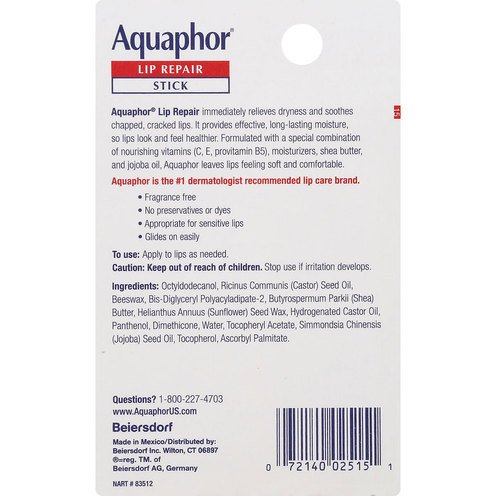 It provides effective, long-lasting moisture, so lips look and feel healthier. Formulated with a special combination of nourishing vitamins (C, E, provitamin B5), moisturizers, shea butter, and jojoba oil, Aquaphor leaves lips feeling soft and comfortable. No preservatives or dyes. Appropriate for sensitive lips. Glides on easily. Made in Mexico.