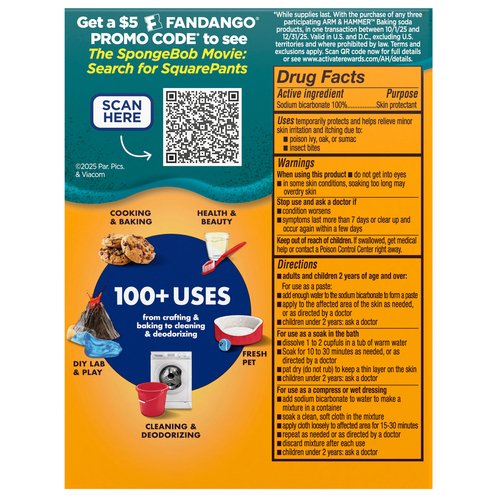Other Information: Each 1/2 teaspoon contains: 656 mg sodium. The standard of purity. America's #1 trusted baking soda brand. 100+ uses from crafting & baking to cleaning & deodorizing. Cooking & baking. Health & beauty. DIY lab & play. Fresh pet. Cleaning & deodorizing. Not tested on animals. Certified Rewewable Energy. Green-e. Made with 100% renewable electricity.