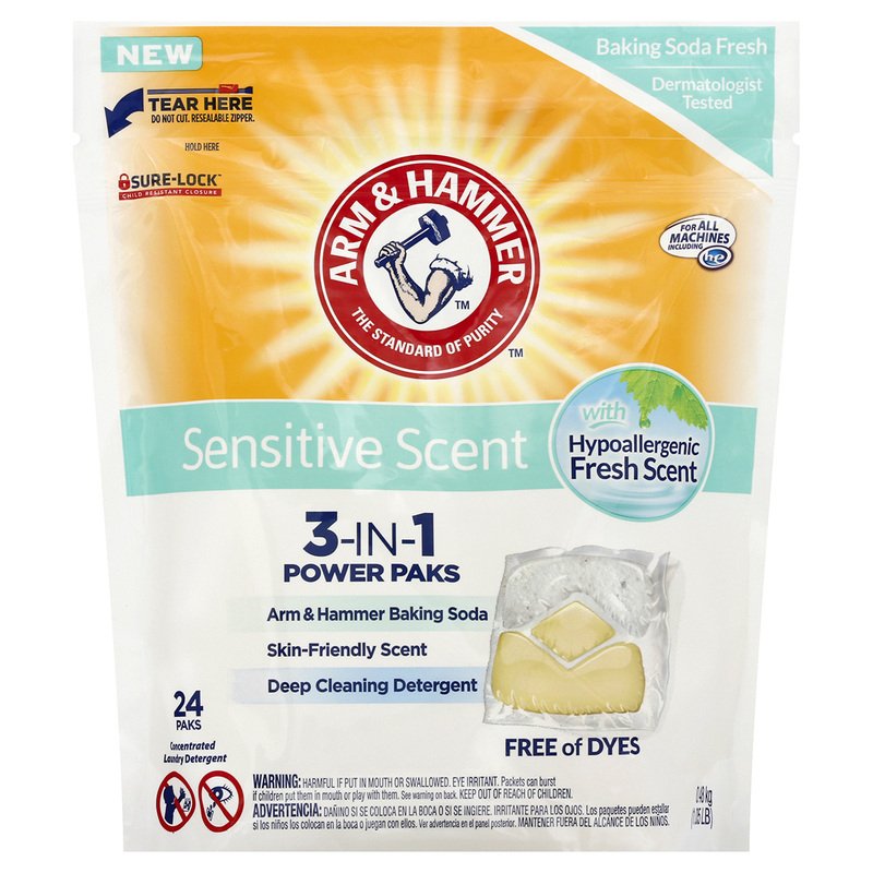 3-in-1 power paks with hypoallergenic fresh scent. Skin-friendly scent. Deep cleaning detergent. Baking soda fresh. Dermatologist tested and free of dyes. Sure-Lock: Child resistant closure.