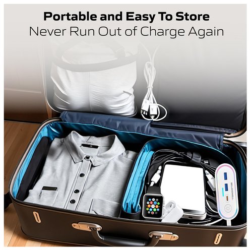 Upgrade your charging experience with this LED Fast Charging Station, designed to power up to five devices at once. Featuring two AC outlets, a USB port, and a Type-C port, it ensures compatibility with a wide range of devices. Charge your gadgets up to three times faster than with a standard 5W charger, while built-in surge and short circuit protection provide peace of mind. The integrated RGB and color-changing night light adds a stylish touch to your space, and the easy-to-use light switch lets you adjust the lighting to your preference.