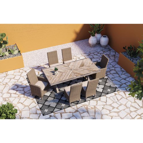 Sporting an easy-on-the-eyes look inspired by driftwood, the Beachcroft dining table elevates the art of indoor-outdoor living. Beautiful and durable enough for indoor and outdoor use, this high-style/low-maintenance table charms with X-leg farmhouse styling and wows with a thick porcelain table top that’s a natural complement.