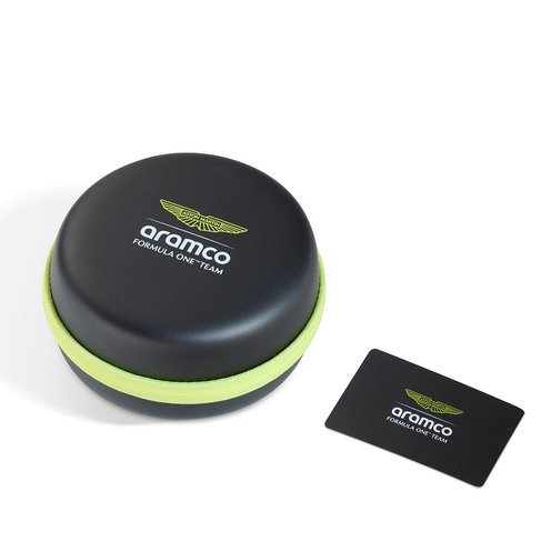 Born on the track, the DWF watch channels Formula 1 energy with a 43mm carbon fiber case, bold squared counters, and the Aston Martin Aramco logo. Pops of podium green and lime essence bring racing flair, while red, yellow, and green pushers pay tribute to the starting lights. Powered by a Miyota movement, it features domed mineral glass and a high-performance nato strap with anodized loops. Built to push limits, on and off the circuit.