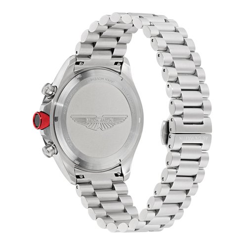 Meet SPT, a chronograph built to impress.This bold 44mm RSST case matching with the bracelet houses a dial with twin subdials and the Aston Martin Wings logo, delivering a strong, purposeful look. A tachymeter scale encircles the bezel for added utility, while vibrant accents on the dial and crown infuse a dose of racing energy.