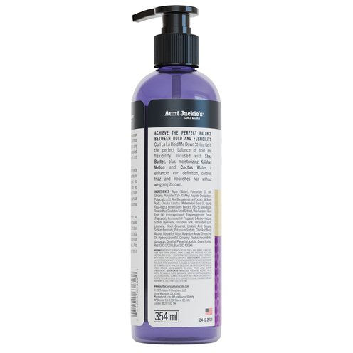 Aunt Jackie's Curls & Coils Curl La La Hold Me Down Styling Gel enhances curl definition and controls frizz. This ultra-moisturizing gel helps achieve the perfect balance between hold and flexibility without weighing down your curls. It nourishes and hydrates hair with a powerful blend of Shea Butter, Kalahari Melon, and Cactus Water. Recover from thirsty, dry hair with shiny, defined curls that feel as amazing as they look! The Curl La La Collection gives your hair the hydration, the hold, and the nourishment it craves – without compromise.