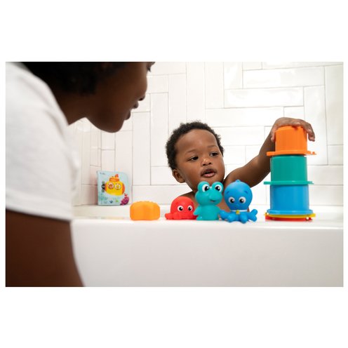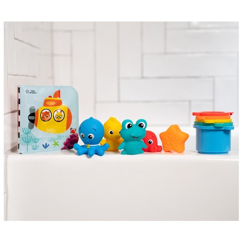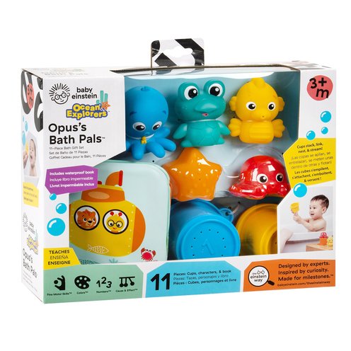 Splash into sensory fun and color learning with the Baby Einstein Ocean Explorers Opus Bath Pals 11-Piece Bath Gift Set. This engaging bath set for ages 3+ months includes 5 fillable cups, 5 animal toys, and a waterproof book to excite the senses, introduce cause and effect, and support fine motor skills.