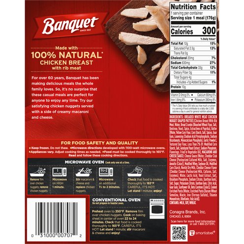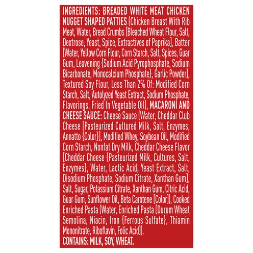 Savor a delicious meal of breaded chicken nugget patties with rib meat and macaroni in a rich cheese sauce.