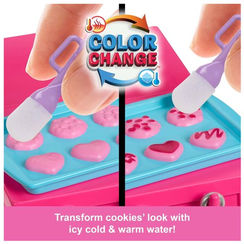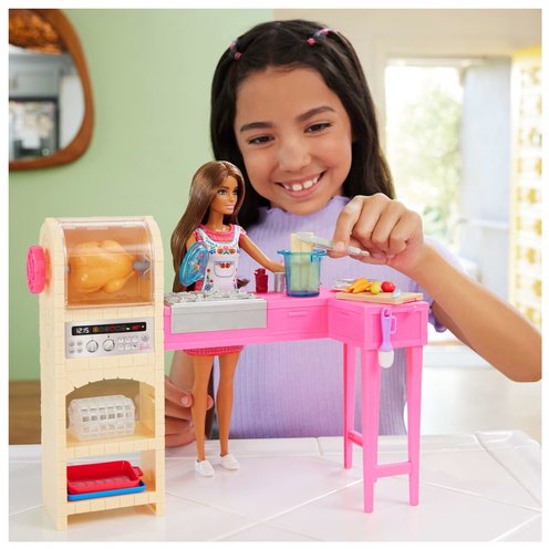 Imaginations can cook up all kinds of stories with this Barbie and Teresa Recipe for Friendship Teresa doll and kitchen playset with more than 20 accessories. Inspired by the movie, Teresa's recipes come to life with a kitchen furniture piece featuring a rotating rotisserie oven, tamales that fit in a pot and color-change cookies. Young foodies will love the realistic play opportunities as they cook veggies and serve a 'yummy' meal. Teresa doll is dressed to chef wearing her signature look detailed with the apron gifted to her by her grandmother. Kids and fans ages 3 years and older will love recreating scenes and making up new recipes for adventure! Doll cannot stand alone. Colors and decorations may vary.