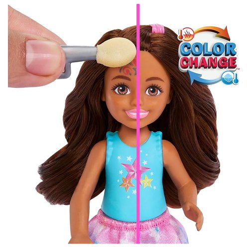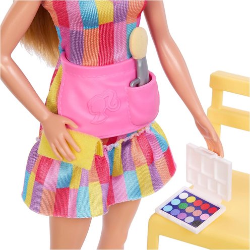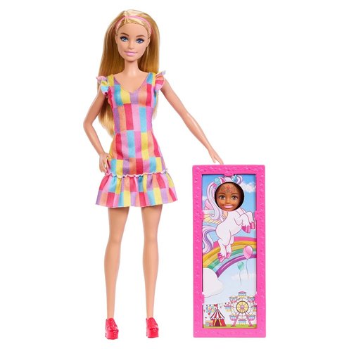 The Barbie Day at the Fair playset provides an exciting experience filled with face painting, photo-taking, and dress-up activities for Chelsea doll. Barbie doll can paint Chelsea's face at the pink booth, where a makeup sponge and water reveal a fun design. Chelsea can then capture the moment by posing behind the charming cutout photo stand. This set also includes delightful accessories like fairy wings and a unicorn headband for imaginative dress-up play, and the entire booth conveniently closes up into a suitcase for simple storage and portability, ensuring the fair day fun can continue anywhere.
