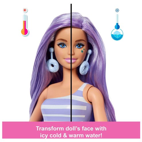 Barbie Pop Reveal Treat Series dolls offer a sensory experience with eight surprises to discover inside a sweets-inspired cup! Unscrew the whipped topping lid to find moldable sand and poke through the film with the straw for squishy fun. Peel the film on the cup to reveal a sweet-scented Barbie doll and six more surprises! Which doll will you reveal? There's Donut Dreams, Cool Cupcake and Sweet Swirl. Continue opening to discover two reusable ice cubes that pop open to reveal themed earrings and a pair of shoes or boots. Mystery bags reveal a colorful skirt, a squishy scented pet and a matching pet bed. Discover more wow with a color-change transformation on Barbie doll's face! Kids will want to collect them all. Each doll sold separately, subject to availability. Dolls cannot stand alone. Colors and decorations may vary.
