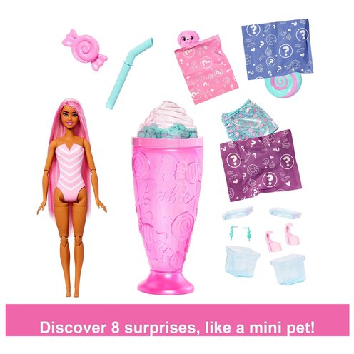Barbie Pop Reveal Treat Series dolls offer a sensory experience with eight surprises to discover inside a sweets-inspired cup! Unscrew the whipped topping lid to find moldable sand and poke through the film with the straw for squishy fun. Peel the film on the cup to reveal a sweet-scented Barbie doll and six more surprises! Which doll will you reveal? There's Donut Dreams, Cool Cupcake and Sweet Swirl. Continue opening to discover two reusable ice cubes that pop open to reveal themed earrings and a pair of shoes or boots. Mystery bags reveal a colorful skirt, a squishy scented pet and a matching pet bed. Discover more wow with a color-change transformation on Barbie doll's face! Kids will want to collect them all. Each doll sold separately, subject to availability. Dolls cannot stand alone. Colors and decorations may vary.