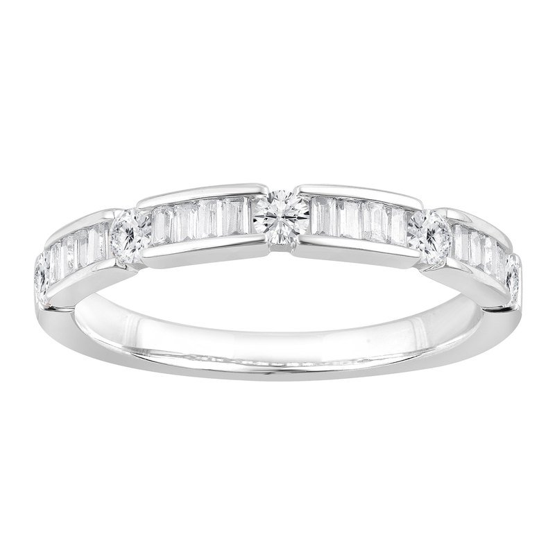 Add a layer of luxurious elegance to your weddingor fashion stack, with this 1/2 Cttw of stunning round and baguette diamond band from our Because by Navy Star® collection.