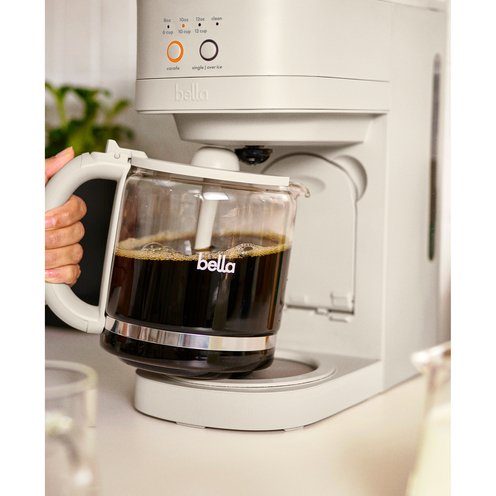 The bella VersaBrew 2-in-1 Coffee Maker is the ultimate coffee flex: brew a single-serve cup (using coffee grounds or pods) or a 12-cup carafe. Part of our Fits-anywhere™ kitchenware system, it also has a slim profile and tucks away neatly under most cabinets. The adjustable drip tray lifts mugs for mess-free brewing and accommodates tall travel mugs up to 7" high. Carafe stays warm after brewing with the keep-warm, easy-to-clean warming plate, and the carafe's lid includes a mixing tube that pushes the coffee back up to ensure a consistent blend. A 61oz water reservoir means less refills.