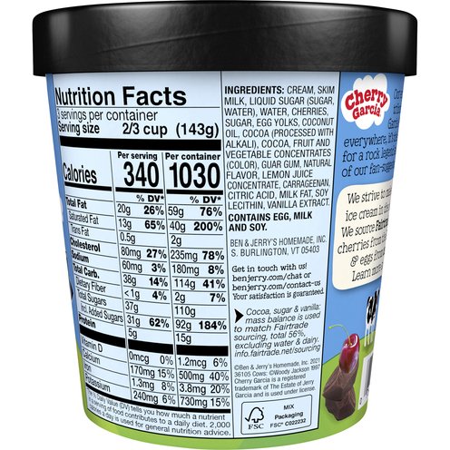 We named this flavor in 1987 for the legendary American guitarist Jerry Garcia after one of our fans sent us the idea on a postcard, and it's been one of our top hits ever since. We use only pure cream to make the cherry ice cream smooth and sumptuous. Then we lace the ice cream with plump sweet cherries and dark chocolatey chunks. Enjoy!