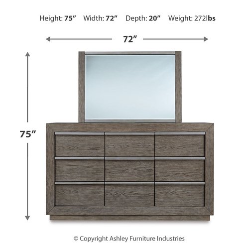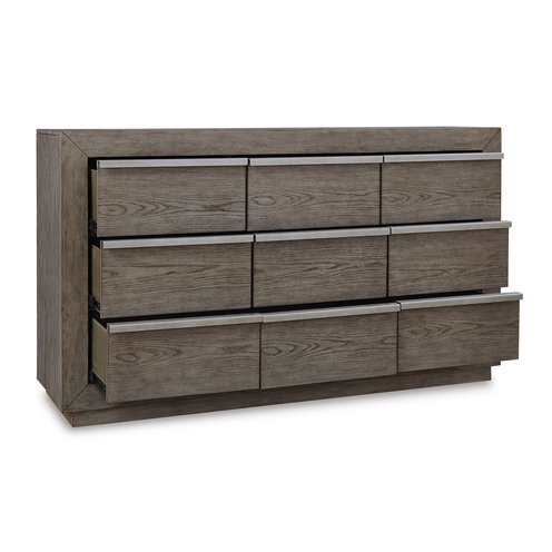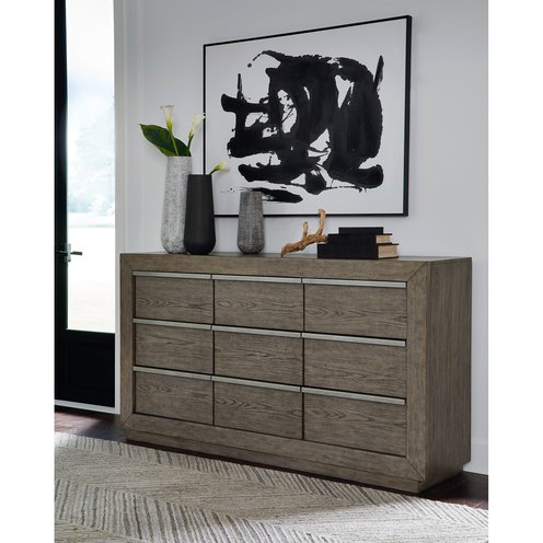Strike the perfect balance of refined and relaxed with this dresser. Full length pewter-tone bar pulls look sleek against the hand-rubbed weathered gray finish. Nine smooth-gliding drawers provide just the right amount of storage space, while a picture frame front further elevates the piece's modern flair.