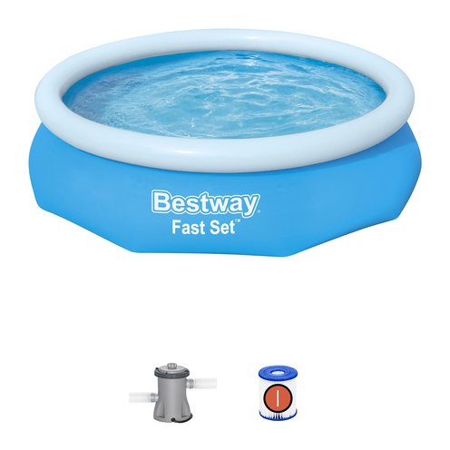 With this quick and easy Bestway® Fast Set™ Pool Set, you’ll be ready for a pool day in no time! The Fill & Rise set-up process is simple - just select a level surface, inflate the top ring and the pool will rise as it’s filled up with water. The sturdy Tritech® liner is made out of an ultra-durable 3-layer material that is reinforced for strength and is 85% more puncture-resistant than PVC. When the season’s over, storage is fast and simple. The water releases easily through the flow control drain valve, and then the pool can fold up for compact off-season storage. This pool is the ideal choice for families looking for a quick and easy pool option for their backyard. Kids will enjoy spending their summer days splashing and playing in the water, and parents can enjoy a nice and relaxing dip as well. The season won’t be complete without the convenient Fast Set Pool from Bestway!