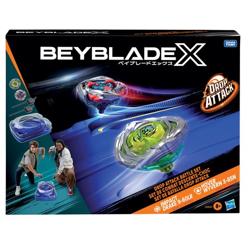 - BATTLE OUT OF THE BOX: Beyblade X Drop Attack Battle Set includes everything kids need to play and compete: Beystadium, 2 right-spinning tops, and 2 ripcord launchers. Assemble the stadium and tops, load your launcher, and 3-2-1 Let it rip!