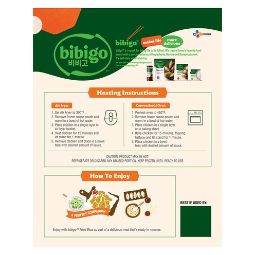 - One 18 oz. frozen food package of bibigo™ Korean Style Crunchy Chicken with Soy Garlic Sauce containing three servings