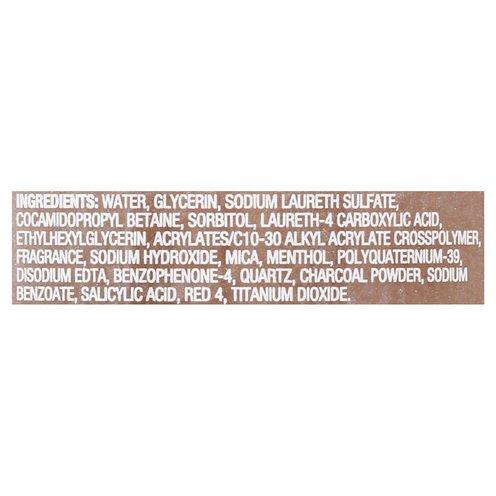 Ingredients: Water, Glycerin, Sodium Laureth Sulfate, Cocamidopropyl Betaine, Sorbitol, Laureth-4 Carboxylic Acid, Ethylhexylglycerin, Acrylates/C10-30 Alkyl Acrylate Crosspolymer, Fragrance, Sodium Hydroxide, Mica, Menthol, Polyquaternium-39, Disodium EDTA, Benzophenone-4, Quartz, Charcoal Powder, Sodium Benzoate, Salicylic Acid, Red 4, Titanium Dioxide.