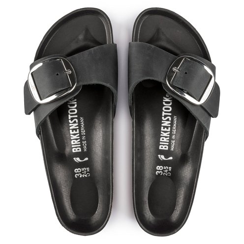 A strap, a buckle and a contoured cork footbed are masterfully combined to create the original Birkenstock sandal - the Madrid. An iconic slide with amplified buckle accent. Shown in oiled nubuck leather.