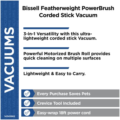 BISSELL® Featherweight™ PowerBrush is a 3-in-1 ultra-lightweight corded stick vacuum that's great for quick and effective multi-surface cleaning. With its powerful motorized brush roll, Featherweight™PowerBrush can be used as a lightweight stick vacuum for speedy cleaning across multiple surfaces, including carpet, area rugs and hard floors. Use the Quick Release Handle to easily convert the machine into a hand vacuum for cleaning above floor surfaces with the crevice tool, or keep the foot on the hand vacuum for cleaning stairs.