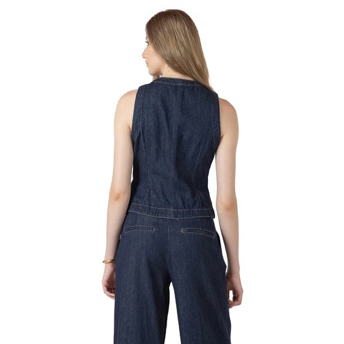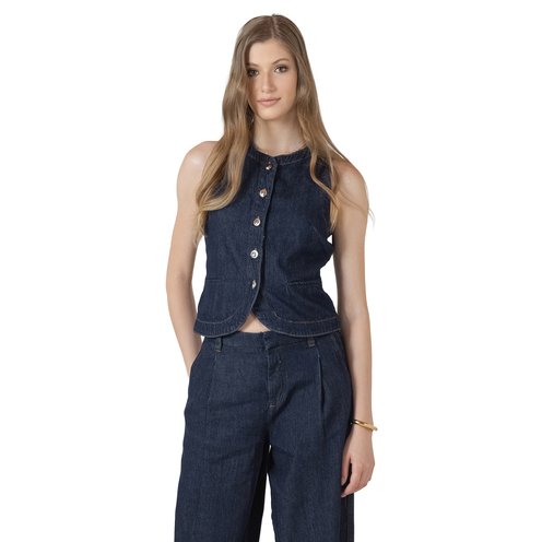 This Black Tape denim vest features a structured fit, button-front detail, and a clean sleeveless silhouette for effortless, modern layering.