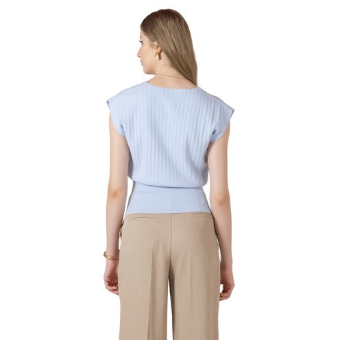 This Black Tape ribbed knit top features a flattering V-neckline, cap sleeves, and a wide waistband for a smooth, polished silhouette.