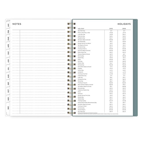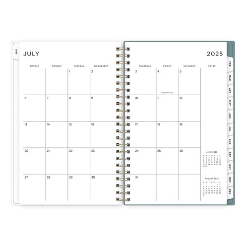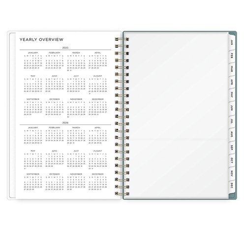 Gear up for school! This academic planner has simple page views for easy planning and a clear plastic storage pocket to keep everything in place. Stay organized with dedicated pages for your yearly goals, contacts, and important dates. Enjoy stand-out style with the Dot Jade green cover design, designed by Ashley G, one of Blue Sky's original collaborators, and chic twin-wire binding in gold. Dated July 2025 – June 2026, this academic planner also includes two non-tabbed bonus monthly views for early planning.