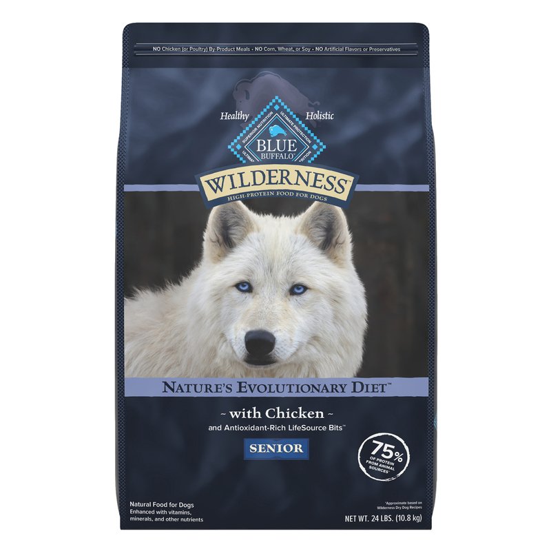 Natural food for dogs enhanced with vitamins, minerals, and other nutrients. With chicken and antioxidant-rich LifeSource Bits. No artificial flavor or preservatives. No chicken (or poultry) by-product meals. No corn, wheat or soy. Healthy Holistic. 75% of protein from animal sources (approximate based on Wilderness dry dog recipes). Nature's Evolutionary Diet: The high-protein foods dogs were born to love. Satisfies the same innate cravings as their wolf ancestors. Starts with the delicious chicken your dog desires. balance protein, fat, and complex carbohydrates for an active life. The Natural Ingredients They Crave: Enhanced with vitamins, minerals, and other nutrients. High-Quality Protein: Deboned chicken, chicken meal, and dried chicken. Complex Carbohydrates: Oats, barley, and brown rice. Fruits and Vegetables: Carrots, blueberries, and cranberries. Nutrition for the Wolf Within: Benefits for Senior Dog: Energy to Stay Active: Maintained by perfectly balanced essential proteins and carbohydrates. Immune System Health: Supported by our antioxidant-rich LifeSouce Bits. Healthy Muscle Maintenance: Supported by high-quality protein from deboned chicken, chicken meal and dried chicken, plus L-Carnitine. Healthy Heart: Supported by Taurine is an important amino acid. Strong Bones & Teeth: Supported by a precise blend of calcium, phosphorus, and essential vitamins. Joint Health: Supported by Glucosamine and Chondroitin. Healthy Digestion & Microbiome: Supported by natural prebiotic sources of fiber. True Blue Promise: Formulated with the Finest Natural Ingredients: Real chicken first ingredient. No chicken (or poultry) by-product meals. No corn, wheat or soy. No artificial flavors or preservatives. Two powerful pieces in one protein-rich meal: Enhancing our nutrient-dense dry foods are exclusive LifeSource Bits, made with antioxidants, vitamins, and minerals and cold-formed to retain their potency. Since 2004, Blue Buffalo has helped raise over $30 million to fund pet cancer research. Made in the USA with ingredients from carefully selected global sourced.