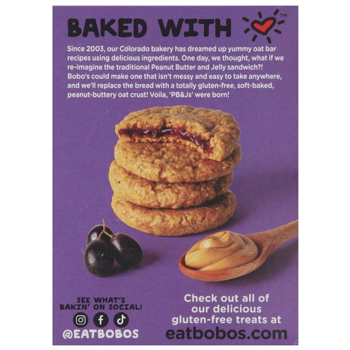 Soft baked peanut butter oat crust with grape filling. 17 g whole grains per serving. Certified gluten free. gfco.org. 17 g whole grains per serving. Whole Grain: 17 g or more per serving. Eat 48 g or more of whole grains daily. Plant-based. Vegan. Dairy-free. Non-GMO Project verified. Baked with love. Since 2003, our Colorado bakery has dreamed up yummy oat bar recipes using delicious ingredients. One day, we thought, what if we re-imagine the traditional Peanut Butter and Jelly sandwich?! Bobo's could make one that isn't messy and easy to take anywhere, and we'll replace the bread with a totally gluten-free, soft-baked, peanut-buttery oat crust! Voila, 'PB&Js' were born! From my family, to yours! I started baking with my daughter "Bobo" in our home kitchen in 2003. All these years later my goal is the same - to make Bobo's taste like homemade treats while using delicious ingredients that warm your heart and home! When I began Bobo's many years ago, our community was so important to our success. As Bobo's has grown, one of our core values has remained - for us to treat our people, planet and community with love! Love, Beryl. Plant-based.