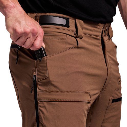 - Pocket Configuration: Large front pockets with utility pockets (4). Low profile, front-facing cargo pockets (2) with quiet-close zipper (L). Internal cell phone sleeve (1), rear welt pockets (2) with quiet-close zipper (R).